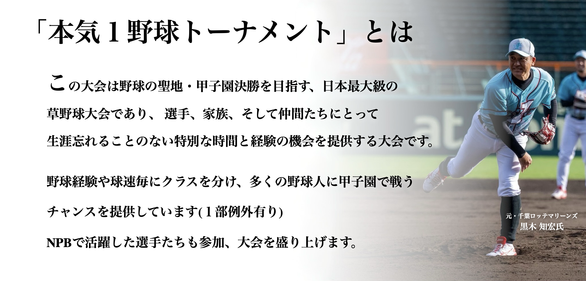 本気1野球トーナメントでは、プロ野球(NPB)で活躍したスター選手たちが大会公式アンバサダーとして共に記憶に残る新しい野球イベントを作り上げていきます。